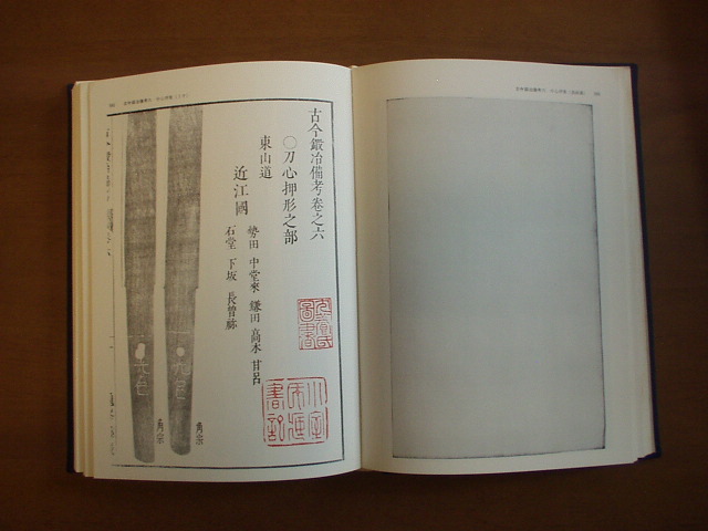 | 犬養木堂注記本 古今鍛冶備考() 第一巻の内容は福永酔剣氏の解説が有り、古今鍛冶備孝の(一)と元暦以前鍛冶銘寄之部が掲載されています。第二巻の内容は古今鍛冶備孝の(二~四)です。(二)は元暦以来銘寄之部でイ、ハ、ニ、ホ、ト、チ、リ、ヌ、ヲ、カ、ヨ、タです。(三)はツ、ナ、ム、ウ、ノ、ク、ヤ、マです。(四)はケ、フ、コ、エ、テ、ア、サ、キ、ユ、ミ、シ、ヒ、モ、セ、ス、混雑です。第三巻の内容は古今 鍛冶備孝の(五~七)です。五の内容は刀剣押方之部で畿内と東海道です。六の内容は刀剣押方之部で東海道と北陸道や山陰道が掲載されています。七の内容は刀剣押方之部で山陰道と南海道や西海道道です。増補として中心押形新古混雑と多田氏系図が増補としてついていますので参考にして頂けると思います。 | |||