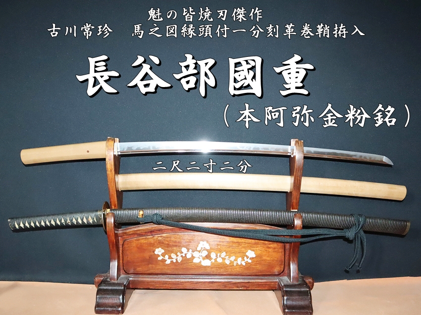 ⭐️長谷部國重(本阿弥金粉銘)二尺二寸二分 魁の皆焼刃傑作 古川常珍 馬之図縁頭付一分刻革巻鞘拵入⭐️