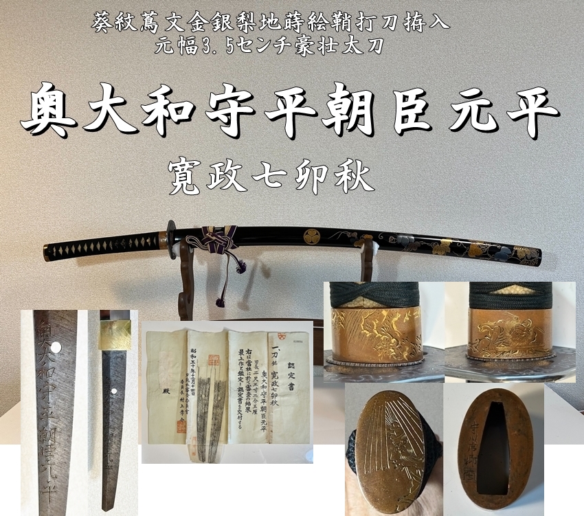 ⭐️奥大和守平朝臣元平 寛政七卯秋 二尺三寸二分五厘 葵紋蔦文金銀梨地蒔絵鞘打刀拵入 元幅3.5センチ豪壮太刀⭐️