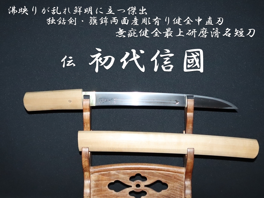 ☆伝 初代信國 沸映りが乱れ鮮明に立つ傑出 独鈷剣・籏鉾両面産彫有り健全中直刃無疵健全最上研磨済名短刀☆【委託販売承中】