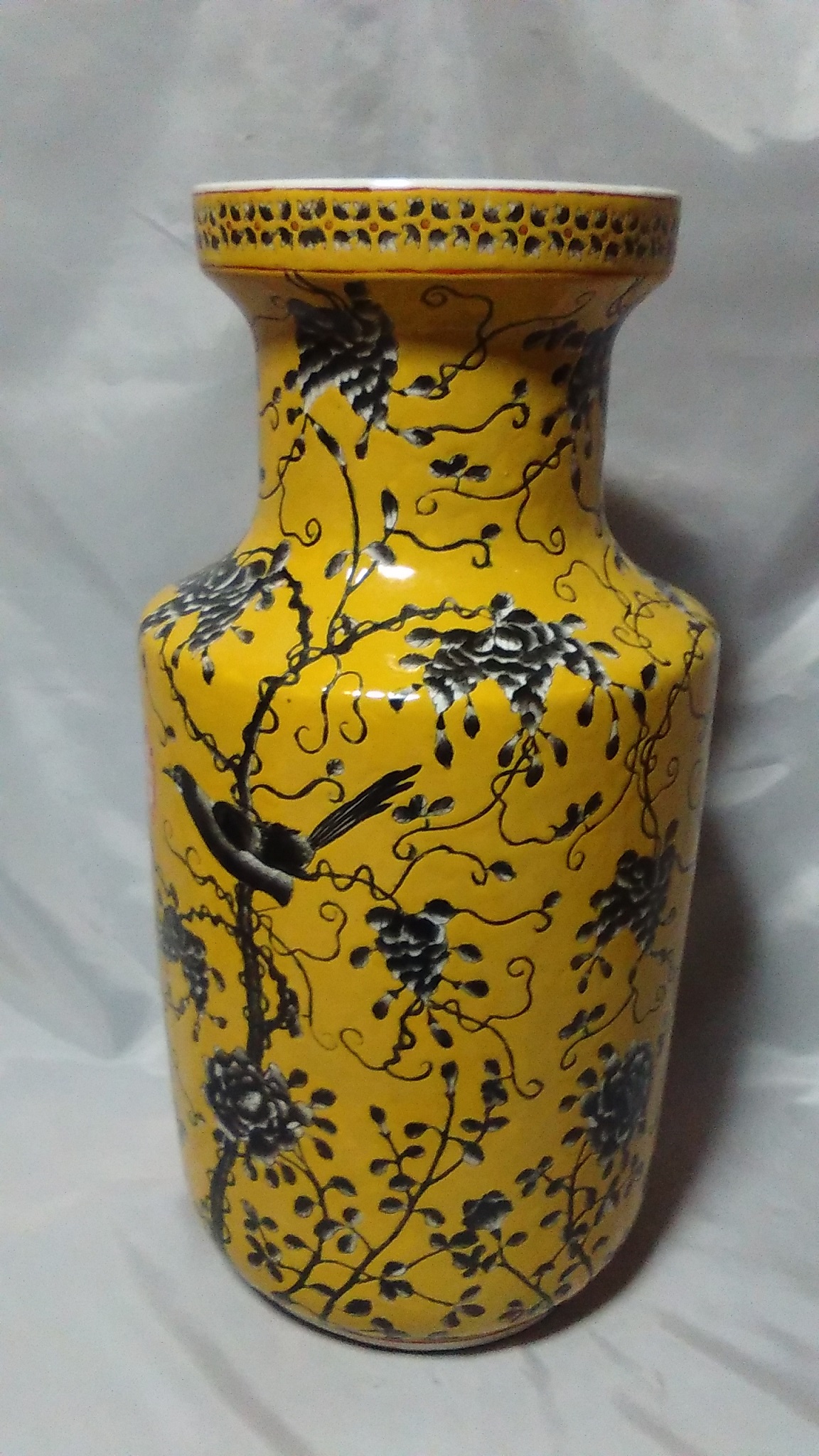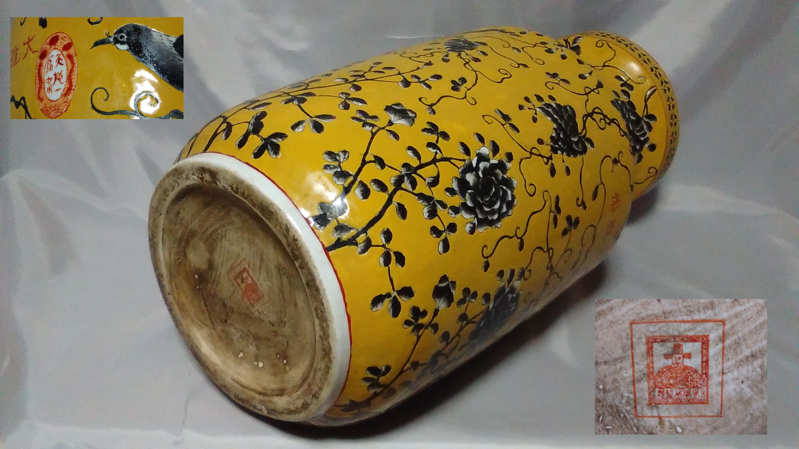 黄地粉彩墨彩 花鳥紋瓶 (支那藤 薔薇 鳥)