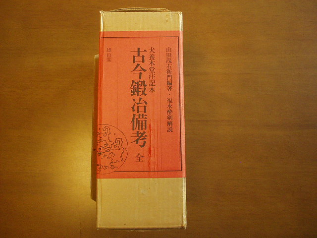 | 犬養木堂注記本 古今鍛冶備考() 第一巻の内容は福永酔剣氏の解説が有り、古今鍛冶備孝の(一)と元暦以前鍛冶銘寄之部が掲載されています。第二巻の内容は古今鍛冶備孝の(二~四)です。(二)は元暦以来銘寄之部でイ、ハ、ニ、ホ、ト、チ、リ、ヌ、ヲ、カ、ヨ、タです。(三)はツ、ナ、ム、ウ、ノ、ク、ヤ、マです。(四)はケ、フ、コ、エ、テ、ア、サ、キ、ユ、ミ、シ、ヒ、モ、セ、ス、混雑です。第三巻の内容は古今 鍛冶備孝の(五~七)です。五の内容は刀剣押方之部で畿内と東海道です。六の内容は刀剣押方之部で東海道と北陸道や山陰道が掲載されています。七の内容は刀剣押方之部で山陰道と南海道や西海道道です。増補として中心押形新古混雑と多田氏系図が増補としてついていますので参考にして頂けると思います。 | |||
