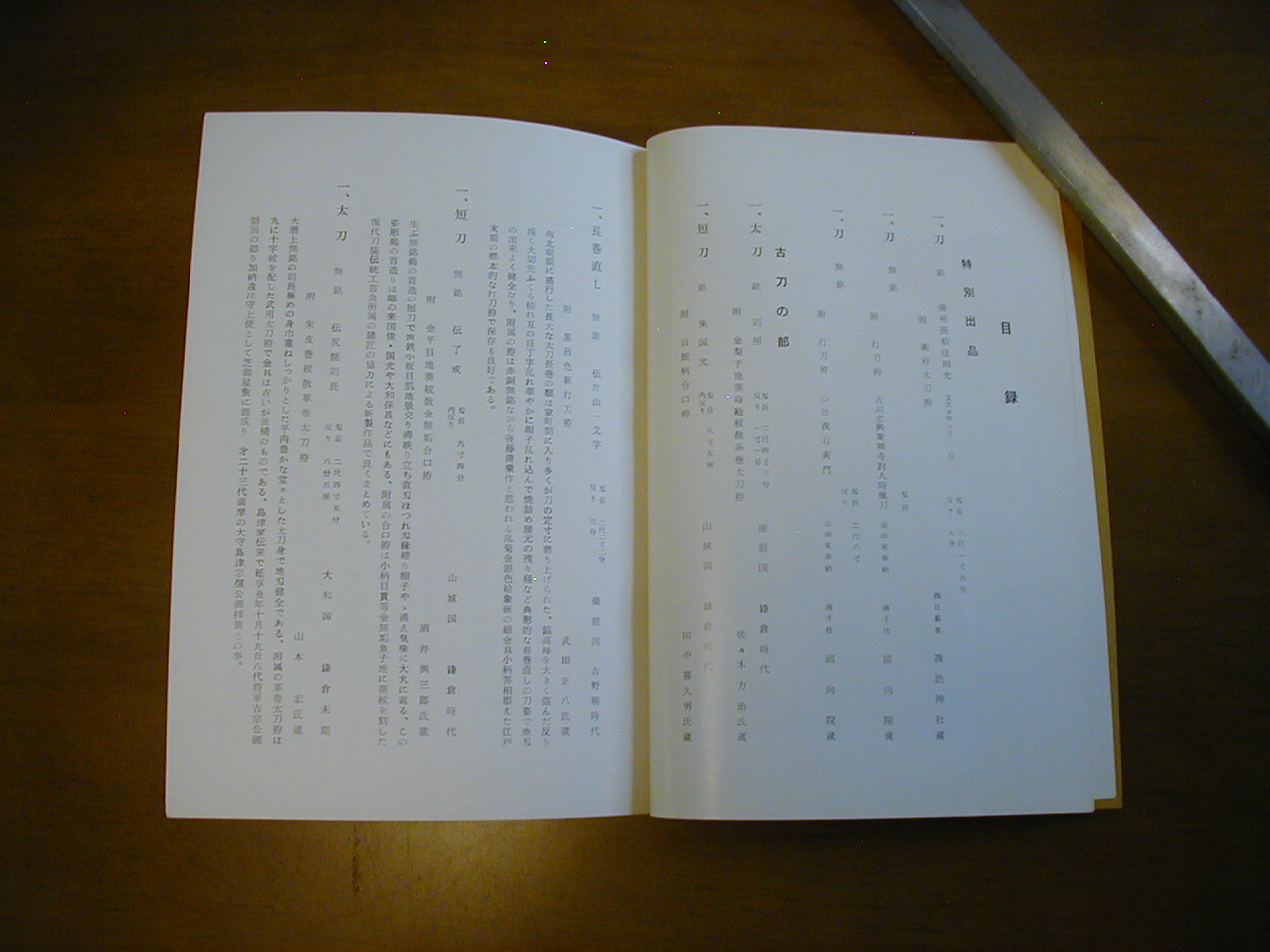 この目録は昭和51年に荒川区教育委員会と荒川刀剣連盟の共催で開催された目録です。主な掲載刀は備州長船住則光(衛府太刀拵) 諏訪神社や七代将軍家継公の則房などの鎌倉時代や室町時代の名工の作品が掲載されています。貴重な資料では無いかと思います。
