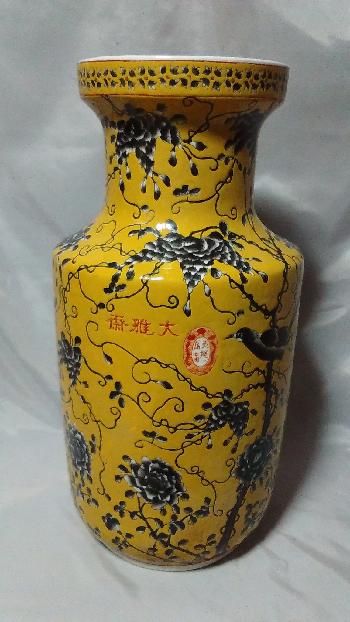 黄地粉彩墨彩 花鳥紋瓶 (支那藤 薔薇 鳥)