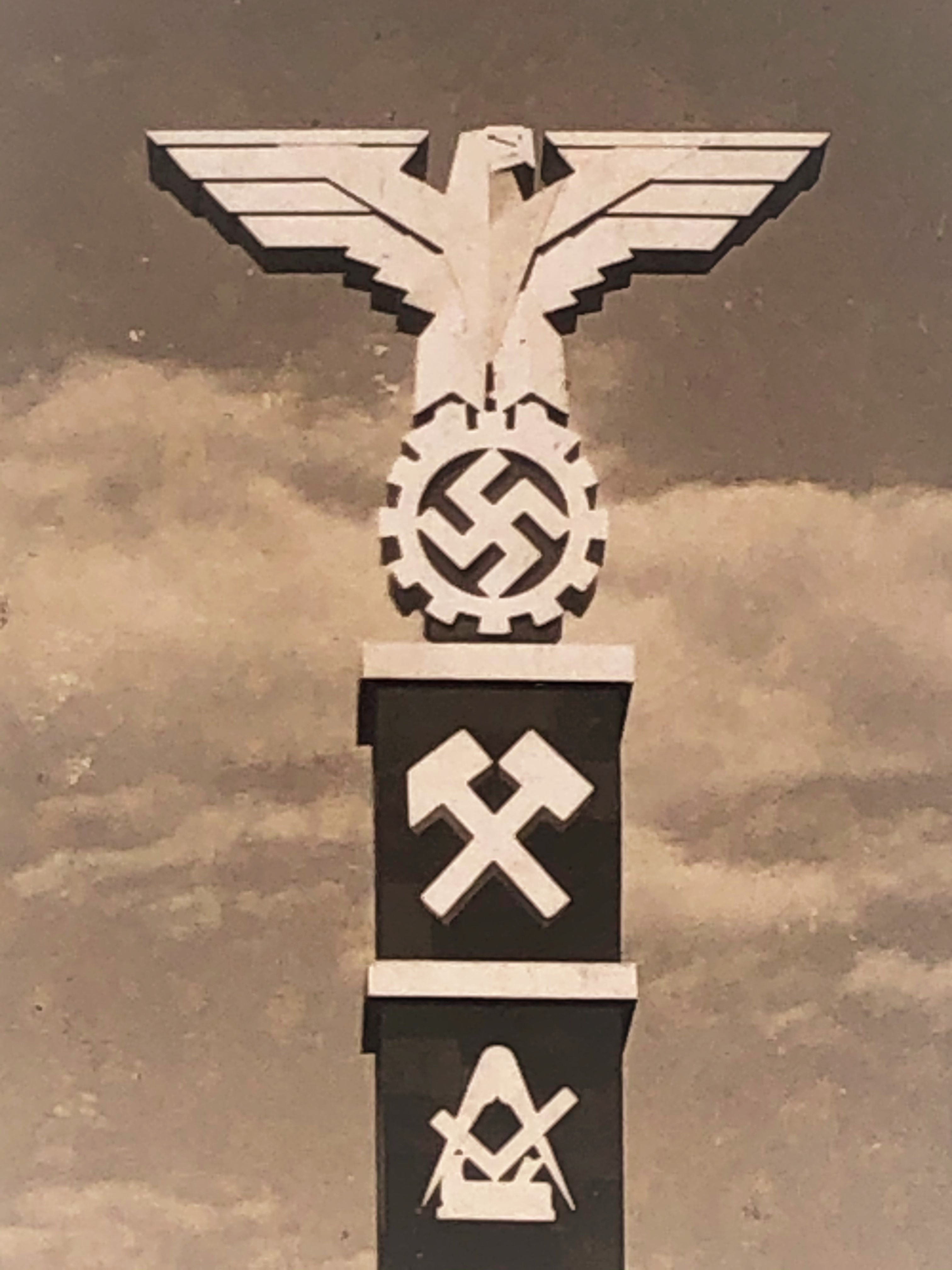 ・ 後方には国旗と双頭鷲、ハーケンクロイツなどの建造物、FUNKTURM(電波塔)、