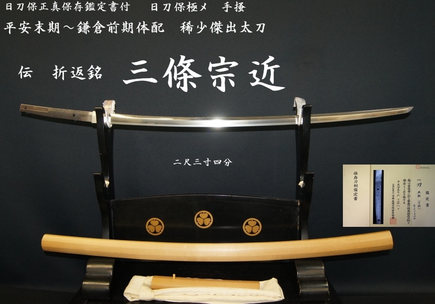 <日刀保正真保存鑑定書付 伝 折返銘 三條宗近 日刀保極メ 手掻 二尺三寸四分 平安末期~鎌倉前期体配 稀少傑出太刀>