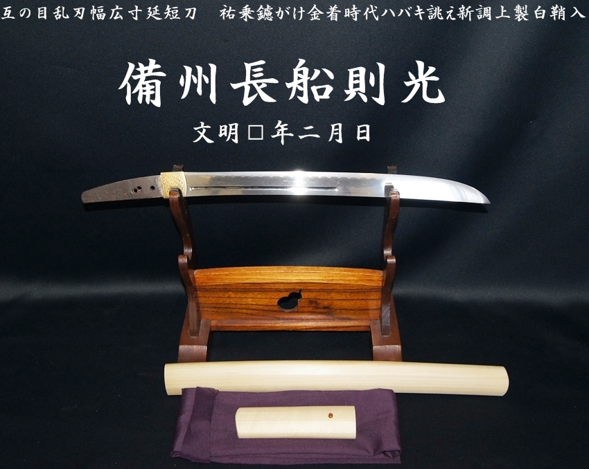 <備州長船則光 文明□年二月日 互の目乱刃幅広寸延短刀 祐乗鑢がけ金着時代ハバキ誂え新調上製白鞘入>