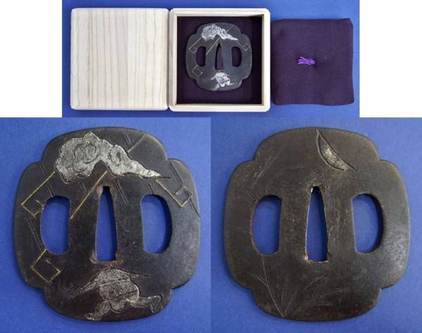 雷に置象嵌雲と人物と月に布目象嵌が施された木瓜型鍔となっています。