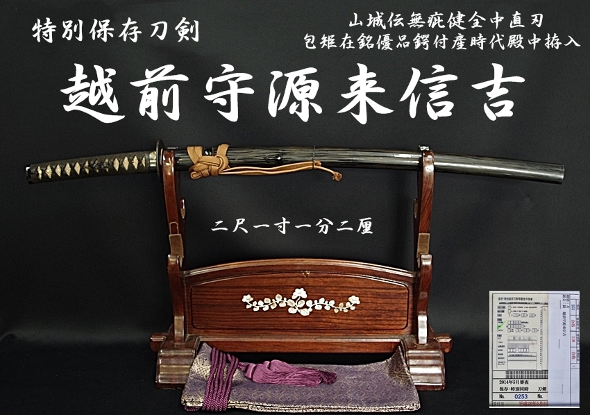 ☆特別保存刀剣☆越前守源来信吉☆山城伝無疵健全中直刃 二尺一寸一分二厘 包矩在銘優品鍔付産時代殿中拵入☆【委託出品承り中】