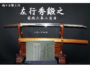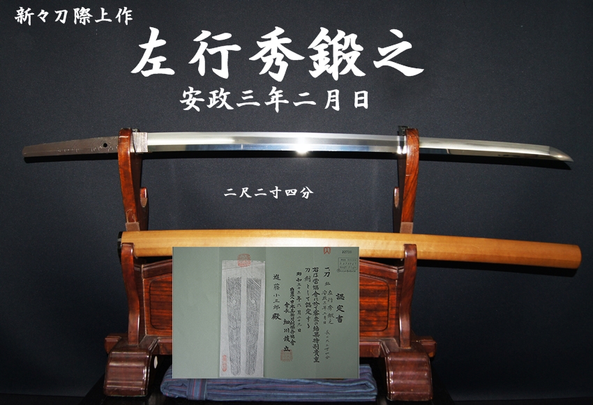 <新々刀際上作 左行秀鍛之 安政三年二月日 二尺二寸四分 小錵深き広直刃小足入無疵健全名刀 特別貴重刀剣認定書付>