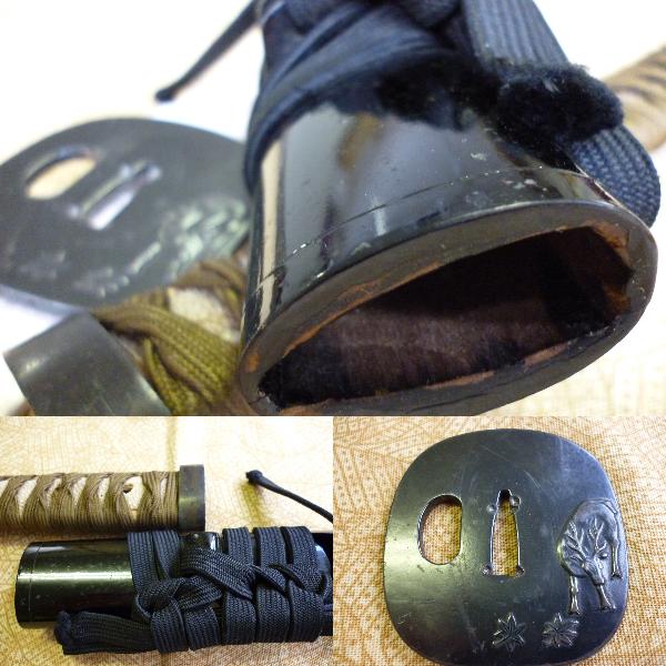 鍔は現代物と思いますが紅葉に鹿の図柄です。良い音がでるので風鈴にしておりました。鞘は割り痛みが少ないようです。刀賭けはついておりません、錆刀の拵えにでもして下さい。あまりに評価が低ければ出品取り消しもあるかもしれません。