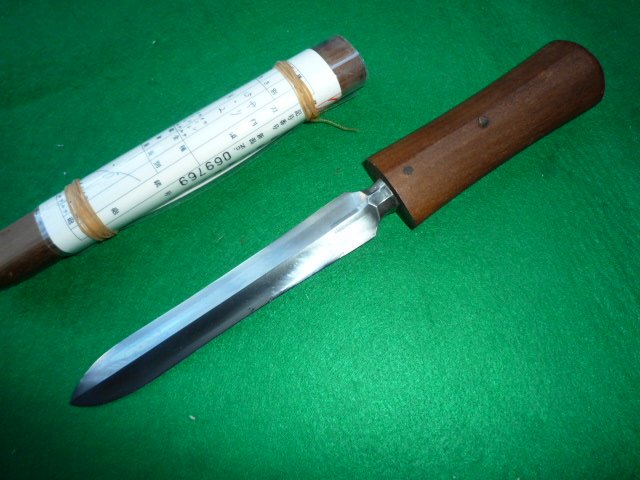 ***登録証付の短刀の拵え白さや 4 中身は両鎬の槍です。全長は28cm 柄は10cm 中身は15.2cm 両鎬の槍が入っています。 在銘 包定です。古とぎです。