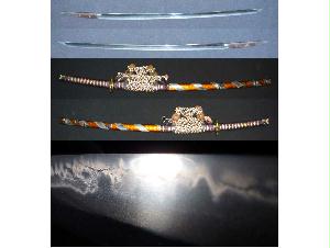 目貫は、菊と桐の三双の家紋になって、金無垢に見える程の、金色の良さです。