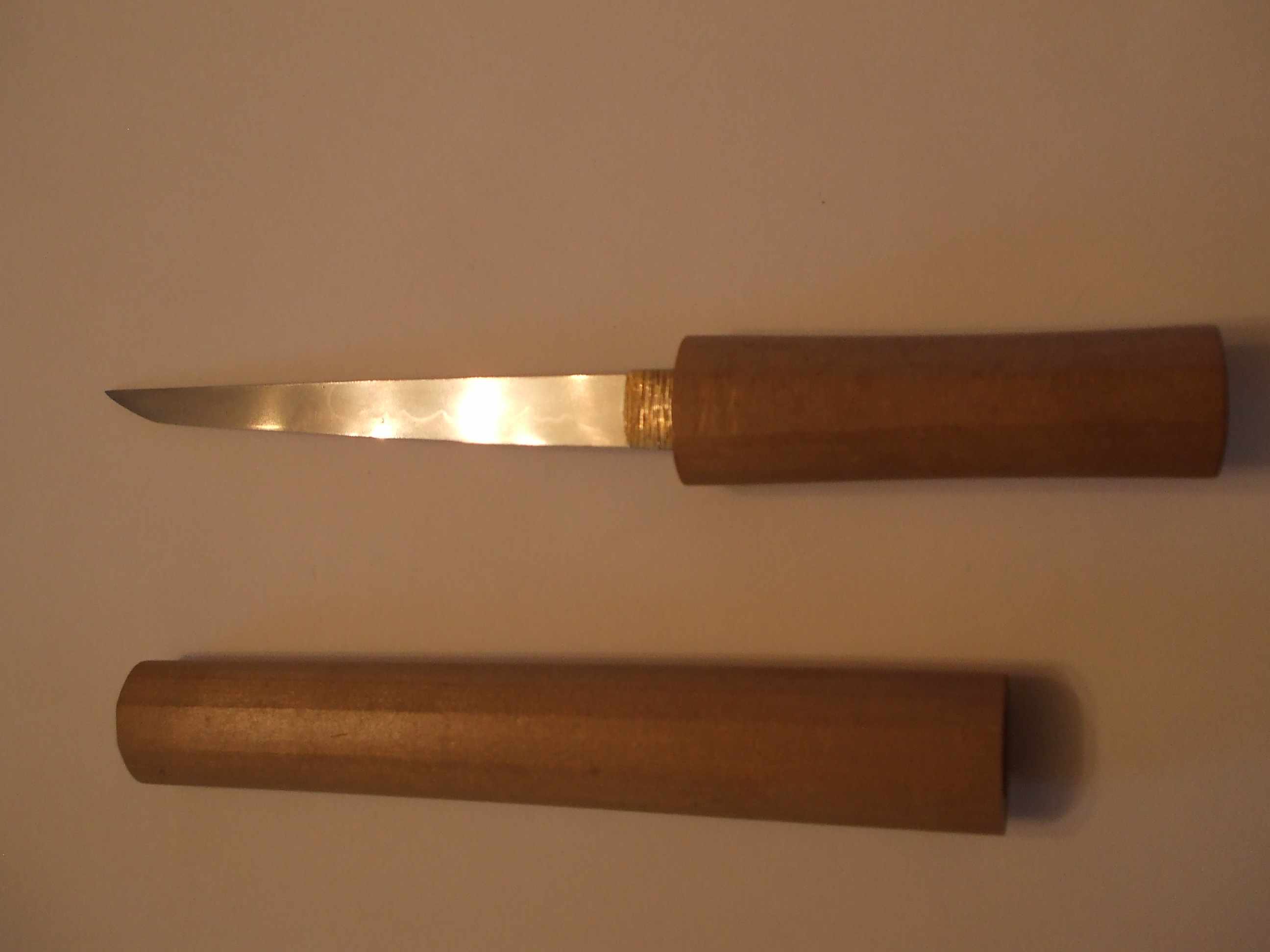 本刀は『河内守藤原國助』の銘の有る小柄です。お手持ちの御刀の小柄としても素晴らしいですし、白鞘が付けられ短刀としての風情も楽しめます。なにより國助らしい刃紋が素晴らしく、見ていて息を飲む程です。この刃紋をいつも楽しめる様に、わざわざ白鞘を新調されたのだと思います。私も毎日机に置き、毎日眺めていました。