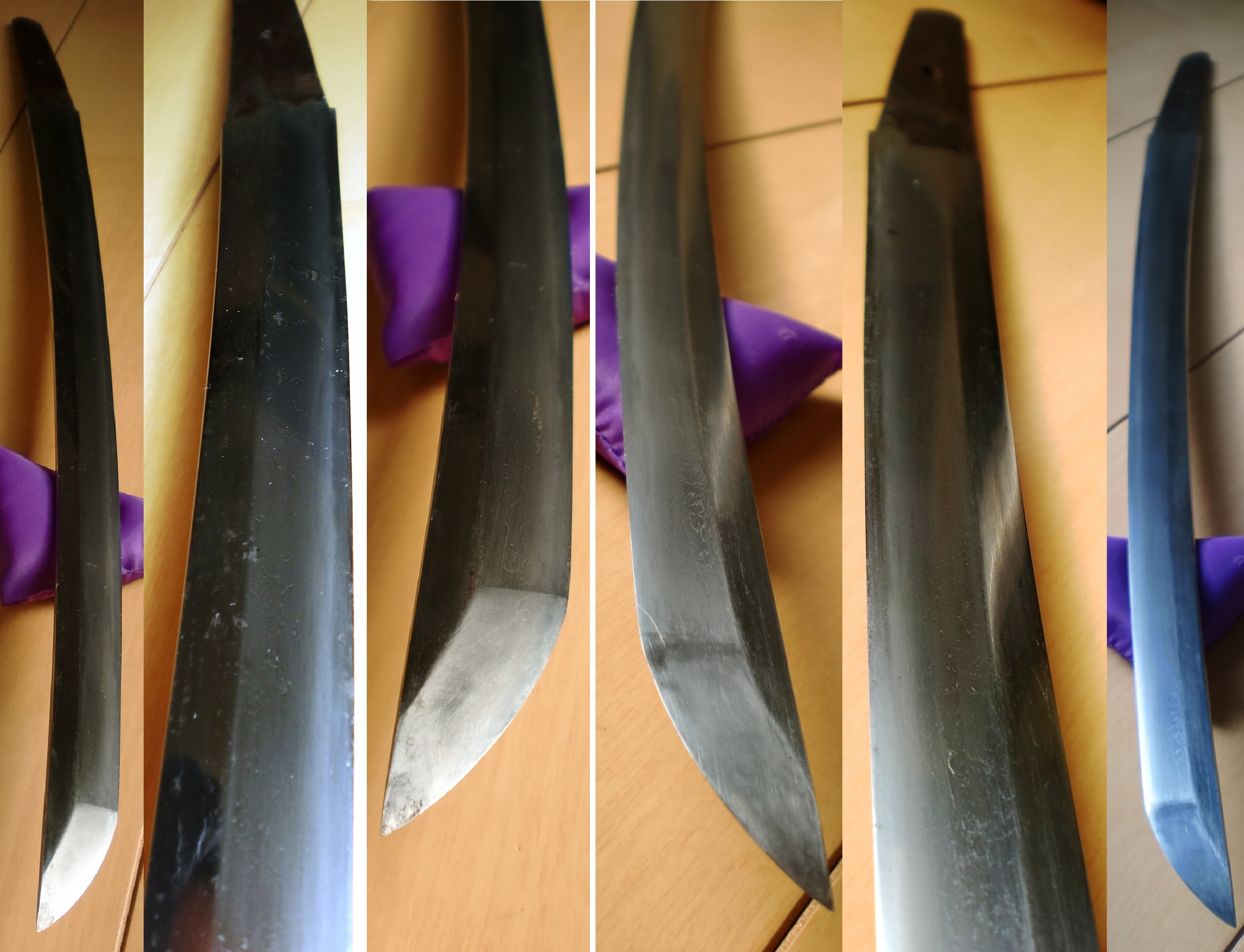 刀身:刃切れ、腫れ膨れ、無し。 鍛え傷、刃毀れ(見て取れないが細かなザラツキあり)、錆、擦れなど有り。