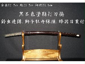 《黒呂色塗鞘打刀拵鈴虫透鐔.獅子牡丹縁頭.蜂図目貫付》全長97.7cm 鞘73.7cm 柄前23.5cm【委託販売承中】