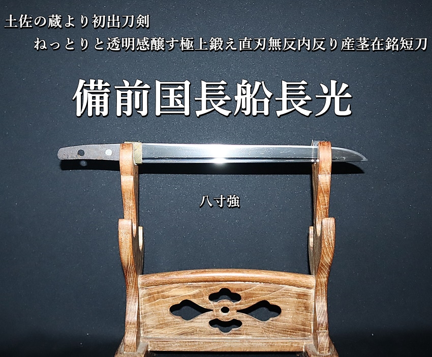 ☆土佐の蔵より初出刀剣☆備前国長船長光 八寸強 ねっとりと透明感醸す極上鍛え直刃無反内反り産茎在銘短刀☆