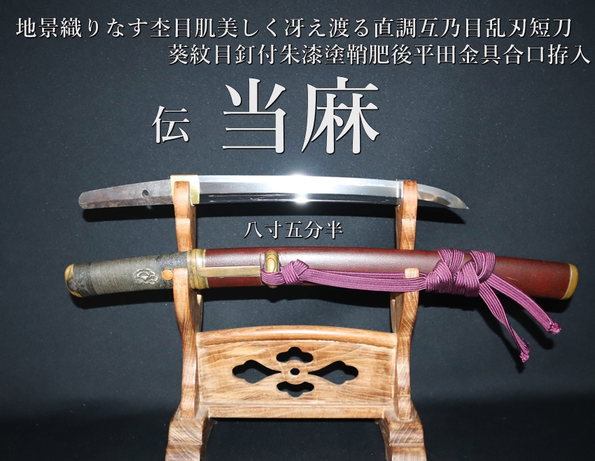 〈伝当麻 八寸五分半 地景織りなす杢目肌美しく冴え渡る直調互乃目乱刃短刀 葵紋目釘付朱漆塗鞘肥後平田金具合口拵入〉
